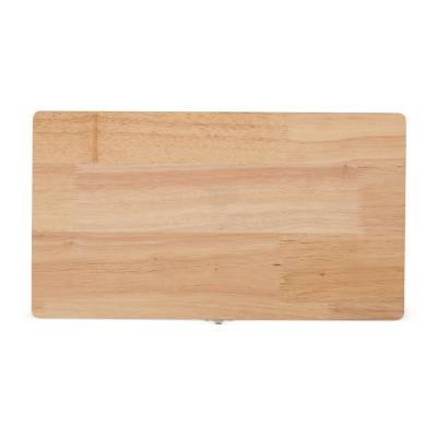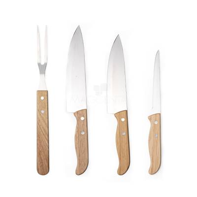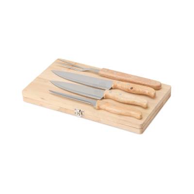 Kit churrasco 4 peças em estojo de madeira. Contém três facas e um garfo.