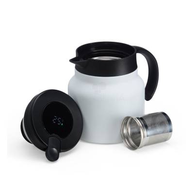 Chaleira térmica 750 ml em inox com infusor, display LED e termômetro digital na tampa para indicar a temperatura do líquido. Possui base antiderrapante, alça e tampa plástica com alavanca de acionamento.