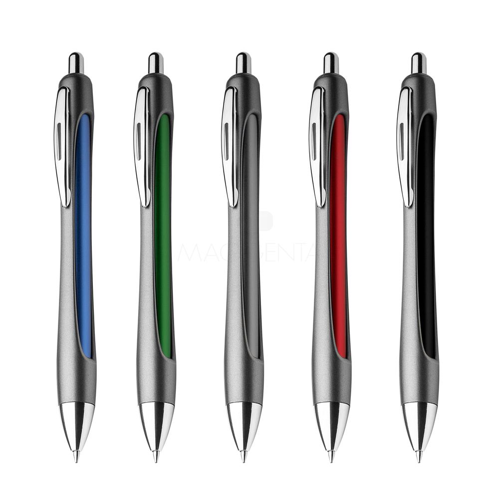Caneta esferográfica em alumínio reciclavel com escrita em azul. Refil tipo parker.