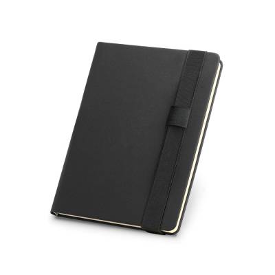 Caderno A5 de capa dura em couro sintético e 140 folhas lisas em cor marfim. Fornecido em bolsa de non-woven.
