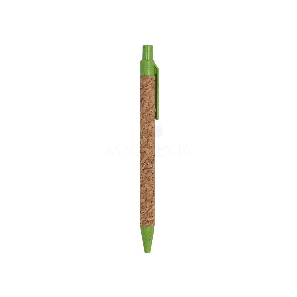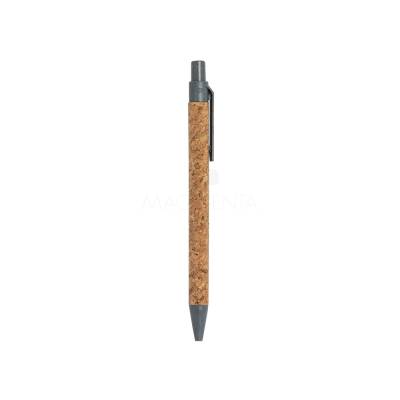 Caneta de cortiça com carga esferográfica azul 1.0mm e acionamento por clique. Clipe plástico, acionador e ponteira plástica.