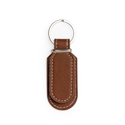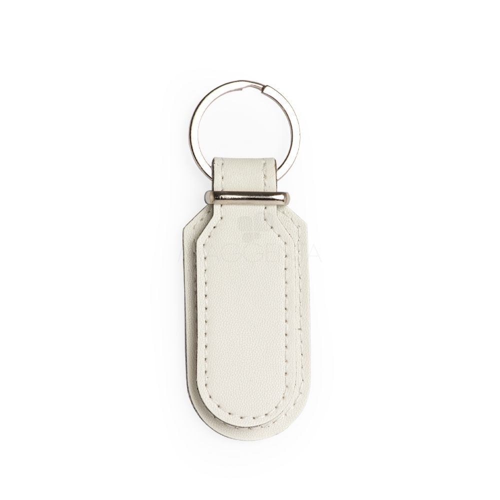 Chaveiro de couro sintético com detalhe em metal e frente e verso lisos.
