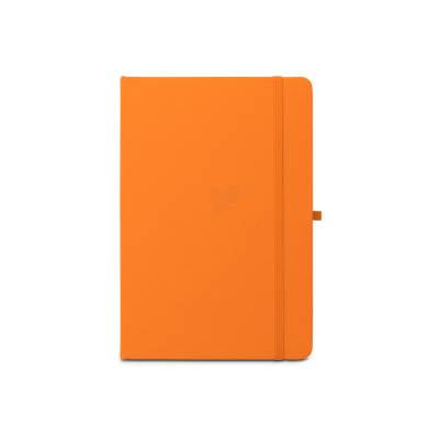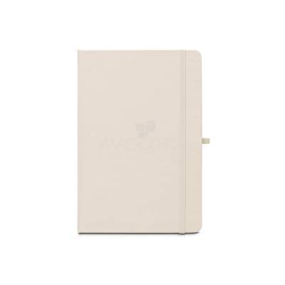 Caderno A5 de capa dura em poliéster 100% reciclado (100% rPET) com cantos redondos. Contém 80 folhas pautadas em papel cor de marfim reciclado, fita separadora, suporte para esferográfica (não inclusa) e elástico para fecho do caderno. Na parte inferior da lombada, tem impresso em branco o símbolo do rPET.