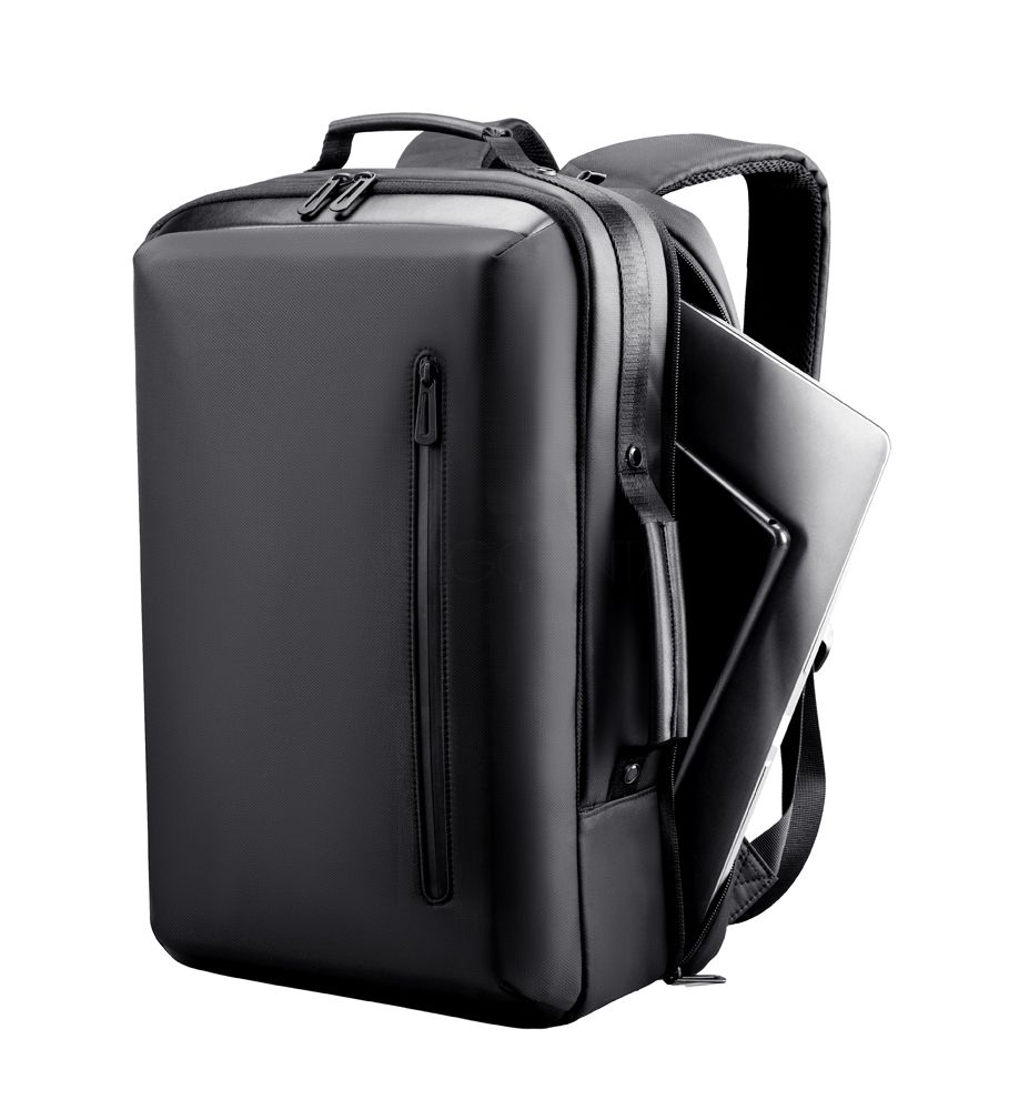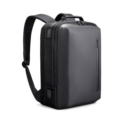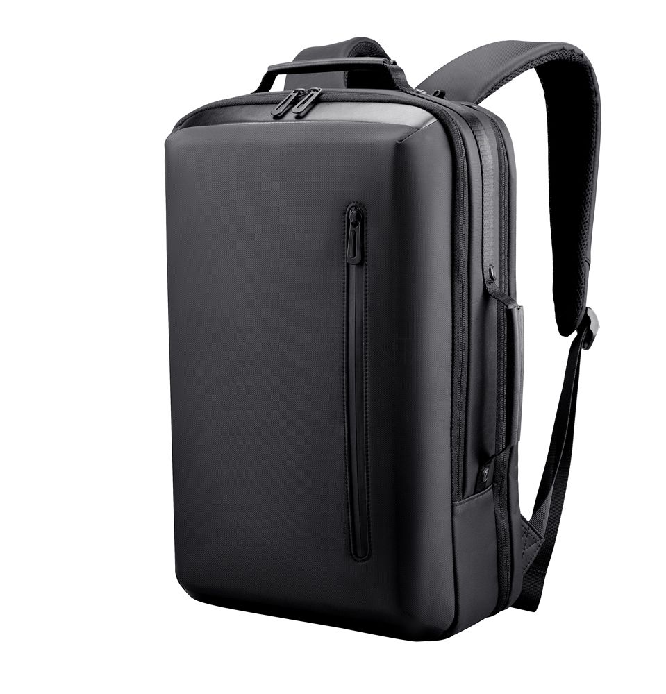 Mochila premium, produzida com poliéster acolchoado, alças de ombro acolchoadas, interior com divisórias com zíper para acomodar pequenos objetos, bolso frontal com zíper e na parte das costas uma divisória atrás do engate para mala de viagem, aceita notebook de até 15,6”, porta USB na lateral.