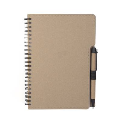 Caderno de anotações em papelão reciclável com suporte para caneta e miolo de 70 folhas pautadas e destacáveis. Acompanha caneta com corpo em papel reciclável com detalhe em plástico.