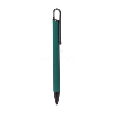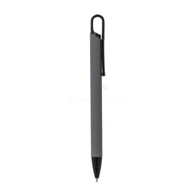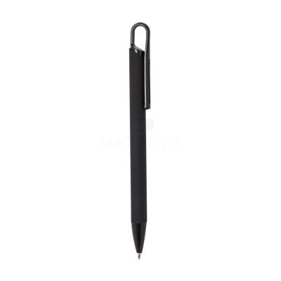 Caneta metálica com acabamento similar à borracha, carga esferográfica azul 1.0mm e acionamento por clique.