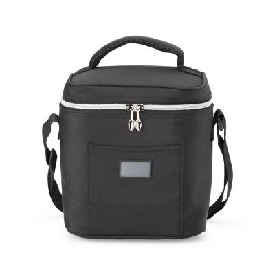 Bolsa Térmica confeccionada em tecido sintético, com bolso frontal e plaquinha plástica para personalização. Possui capacidade de 7 litros e revestimento térmico e acompanha alça transversal para maior praticidade.