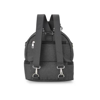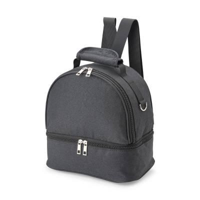 Bolsa térmica dupla em nylon com dois compartimentos térmicos isolados, capacidade de 7 litros. Contém bolso traseiro com zíper, alça de mão e alça para as costas.