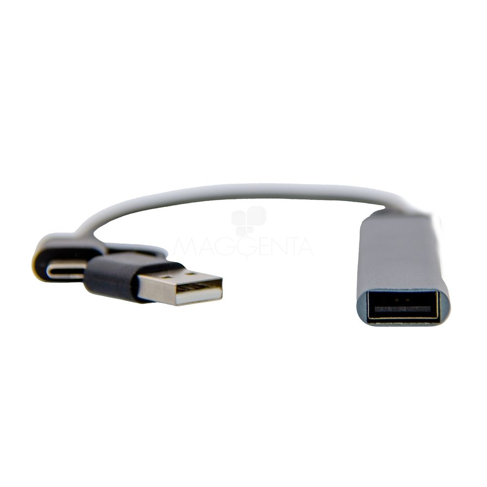 HUB em alumínio com 1 entrada USB, 1 USBC e saída com 3 USB e 1 USBC.