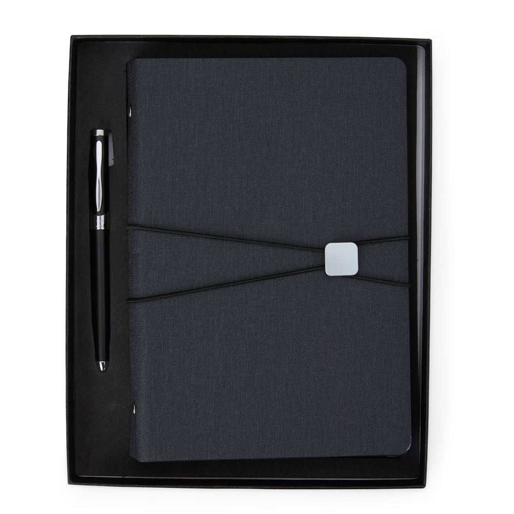 Anote tudo e organize os cartões com o nosso Kit Executivo! Ele vem com uma caneta metálica super sofisticada de 1.0mm na cor preta e um caderno fichário de aproximadamente 96 folhas removíveis, ou seja, dá para trocar, reorganizar e deixar tudo do seu jeito! Os seis anéis garantem praticidade, e a capa dura em couro sintético traz aquele toque elegante durante os registros e planejamentos. E tem mais! São quatro espaços para cartões, sendo um com visor transparente, espaço para guardar anotações, suporte para caneta e fechamento em elástico para manter tudo seguro. Para um toque exclusivo, ainda acompanha uma plaquinha para personalização e embalagem.