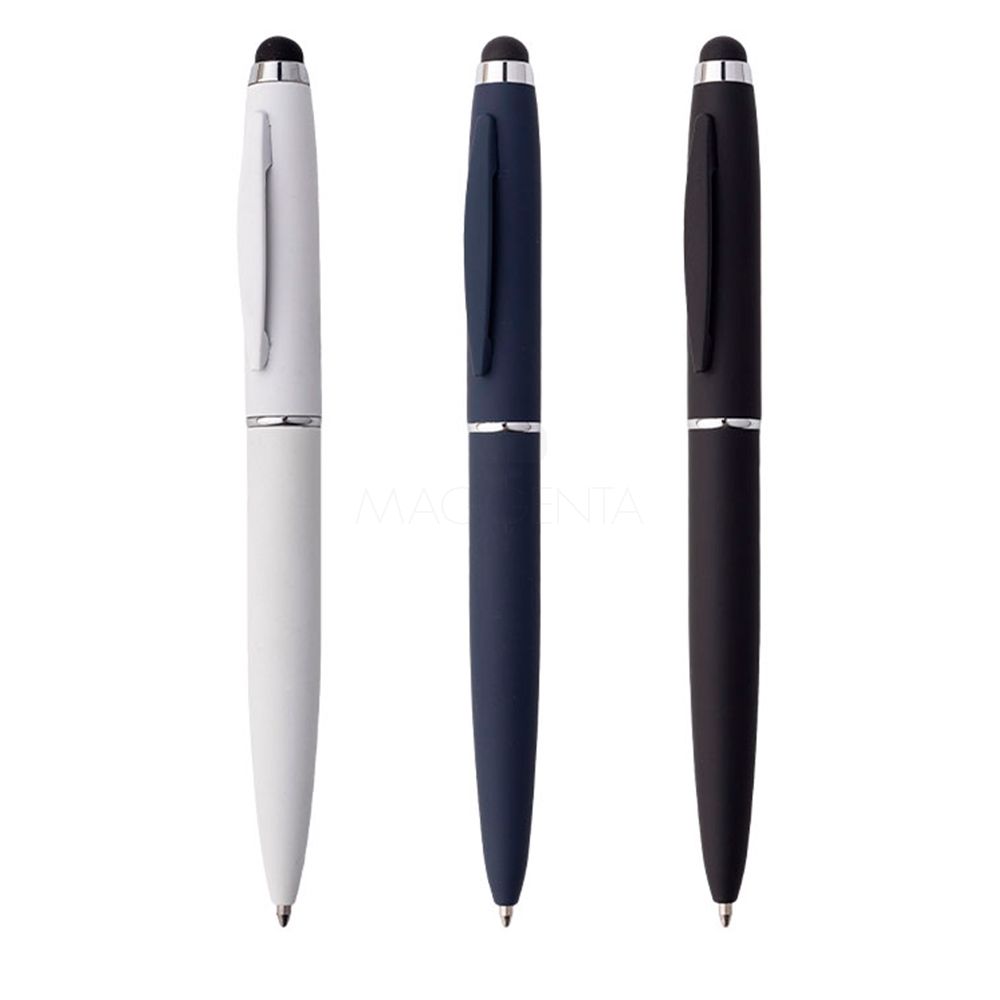Caneta esferográfica de metal com ponteira touch.