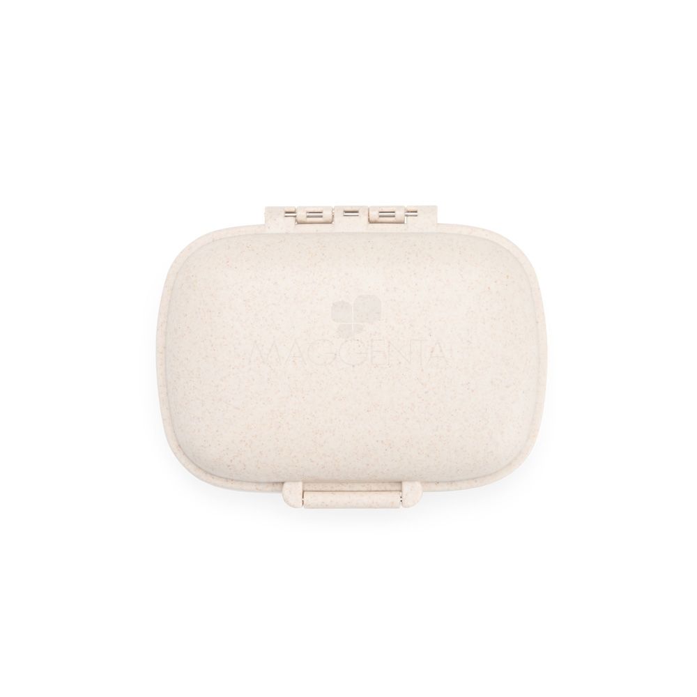 Porta-comprimidos compacto feito em plástico obtido da palha de trigo e anel de vedação para as bordas em silicone. Possui oito compartimentos com tampas removíveis, sendo dois maiores com capacidade de até 30ml e seis menores com até 10ml cada. Acompanha palheta multiuso.