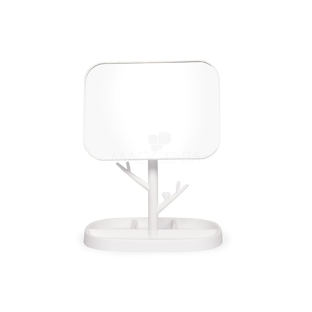 Este espelho de mesa em formato retangular é uma opção funcional e elegante com estrutura em plástico de fácil montagem. Seu pedestal giratório permite o ajuste do espelho em diferentes ângulos e posições. Além disso, contém ganchos laterais e quatro divisórias na base para organizar objetos, ampliando a sua versatilidade.