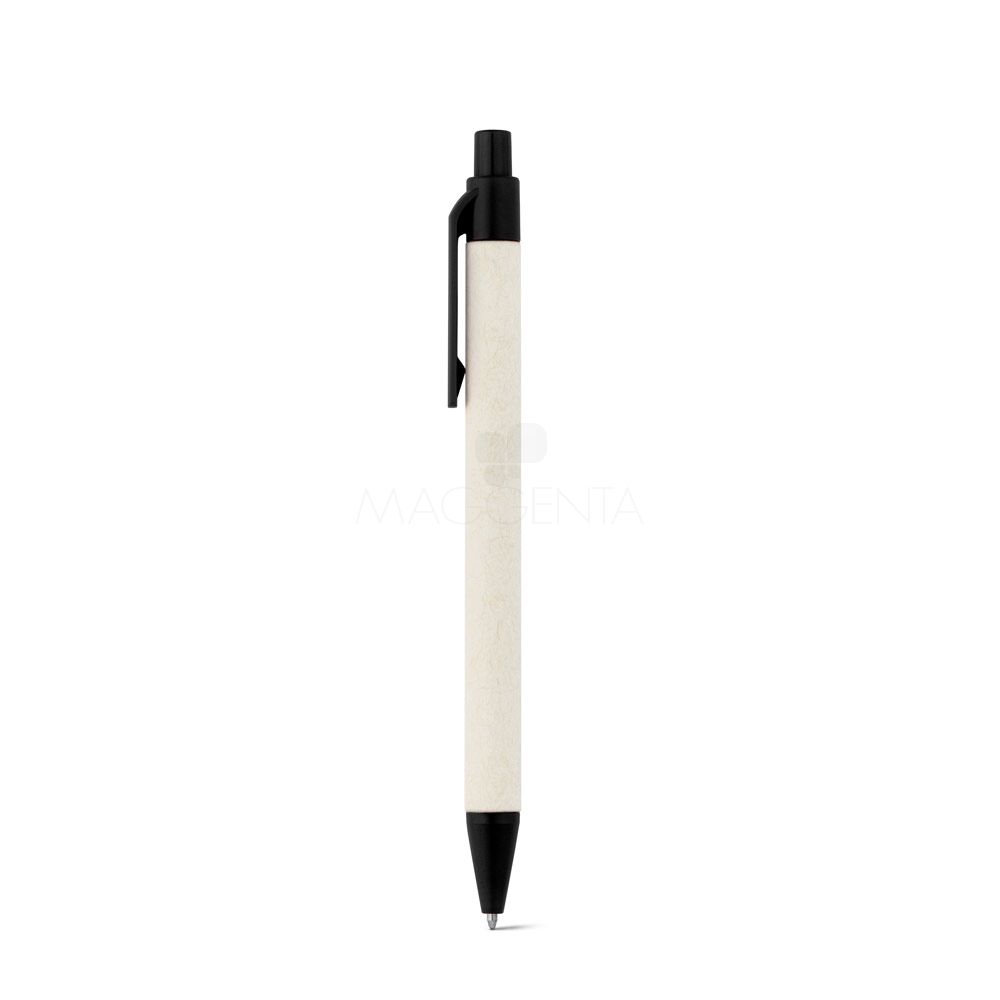 Esferográfica produzida através de pacotes de leite reciclados, contribuindo para o reaproveitamento do cartão e alumínio. Corpo em cartão e componentes coloridos em ABS 100% reciclado. Escrita em azul até 1,5 km.