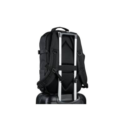 Mochila para utilização diária em ambientes profissionais ou de lazer, ideal também para esportes e caminhadas ao ar livre. O seu design torna esta mochila um produto versátil e resistente. Composta por poliéster reciclado 600D de alta densidade e forro em poliéster reciclado 210D. Possui um compartimento principal com bolso para notebook até 17.3" e diversos bolsos que facilitam a organização dos itens, um bolso com zíper e um bolso lateral. Possui características particulares como cintas de compressão nas laterais, tiras multifuncionais em webbing, alça peitoral ajustável, pega na parte superior e alça para trolley em caso de necessidade. Contém também um emblema removível, com o mesmo material da mochila, ideal para personalização. Capacidade até 21 L.