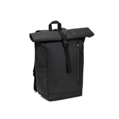 Mochila "Roll top", um design em sistema de fecho que permite enrolar a parte superior até ajustar ao volume da mochila. Composta por poliéster reciclado 600D de alta densidade com revestimento resistente à água e forro em poliéster reciclado 210D. Possui um compartimento principal com bolso almofadado para notebook até 14", bolsos laterais e um bolso frontal com zíper impermeável. O acesso ao notebook pode ser feito pelo compartimento principal ou na parte posterior através do zíper. A parte posterior em malha incorpora uma alça trolley. Capacidade até 20 L.