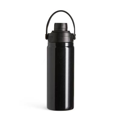 Garrafa térmica em inox com capacidade de até 600ml. Apresenta estrutura com parede dupla e isolamento a vácuo, permitindo conservar a temperatura de líquidos por mais tempo. Possui tampa plástica rosqueável com proteção para o bocal e alça fixa para transporte.