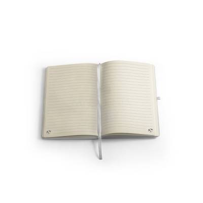 Caderno A5 de capa dura, ideal para personalização em sublimação. O caderno em poliéster 100% reciclado (rPET) 300D tem 160 páginas pautadas em papel 100% reciclado cor de marfim, uma fita separadora, um suporte para esferográfica (não inclusa) e um elástico para fecho do bloco.