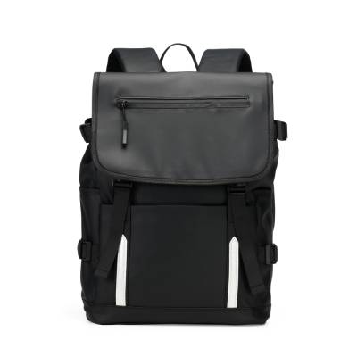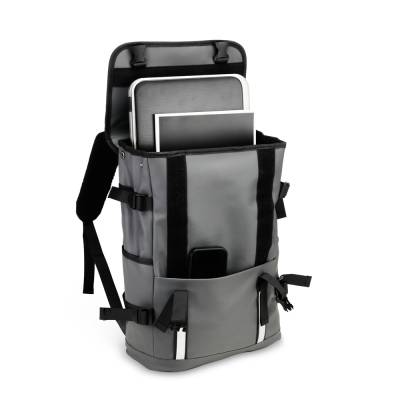Mochila confeccionada em couro sintético com capacidade máxima de 18 litros. Possui abertura com zíper, tiras frontais em velcro e engate rápido. Apresenta divisória interna para notebook de até 15,6 polegadas, além de dois bolsos laterais e dois frontais, sendo um com fechamento em zíper próximo à abertura. Conta ainda com alças ajustáveis, costas acolchoadas em espuma respirável e engate traseiro para malas.