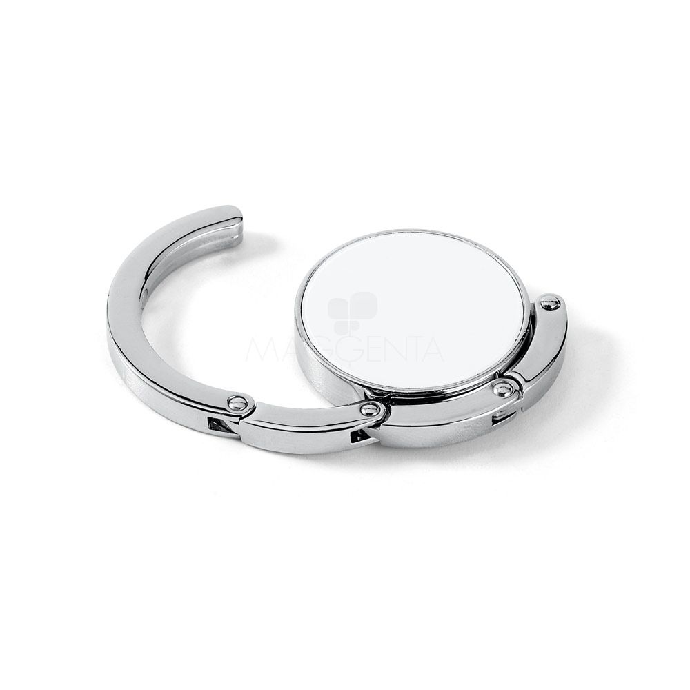 Suporte de bolsa resistente em metal. O suporte pode ser colocado numa superfície para pendurar a sua bolsa. Quando está recolhido permanece junto à base devido ao seu ímã.