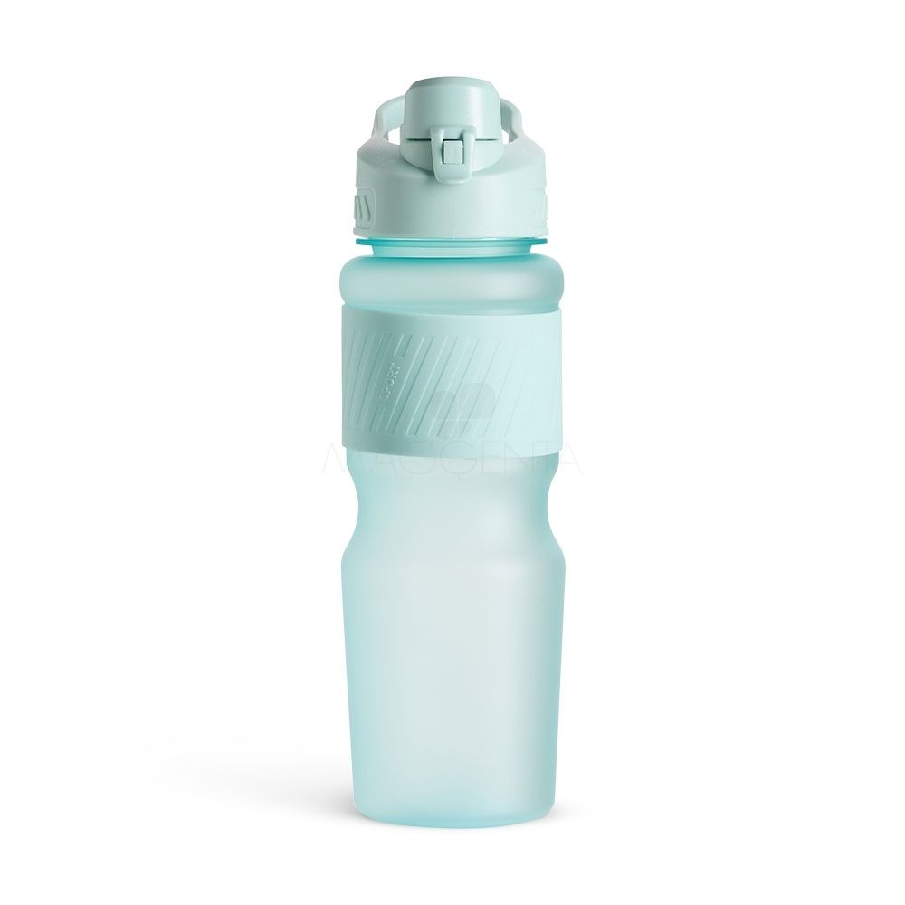 Squeeze plástico com acabamento fosco e capacidade de até 750ml. Possui luva emborrachada, tampa rosqueável com bocal e alça fixa para transporte. O bocal conta ainda com uma tampa de proteção com trava de segurança.