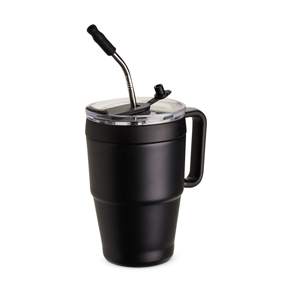 Caneca térmica em inox com pintura eletrostática e capacidade de até 600ml. Apresenta estrutura de parede dupla, base antiderrapante e tampa plástica com vedação a vácuo, protetor emborrachado para o bocal com acesso para canudo. Acompanha canudo de inox com ponta removível em plástico.