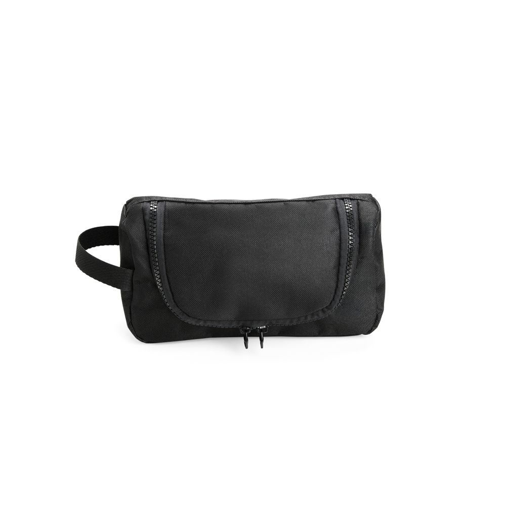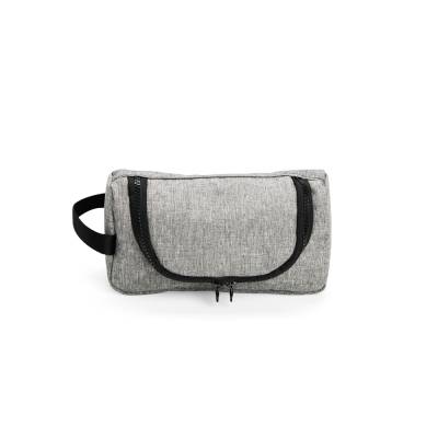 Nécessaire confeccionado em nylon resistente à água e fechamento em zíper. Possui divisória interna em tela de nylon e alça lateral para transporte.