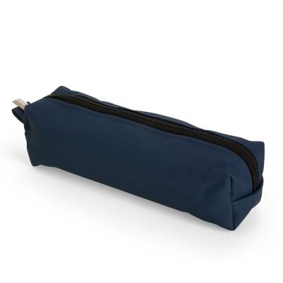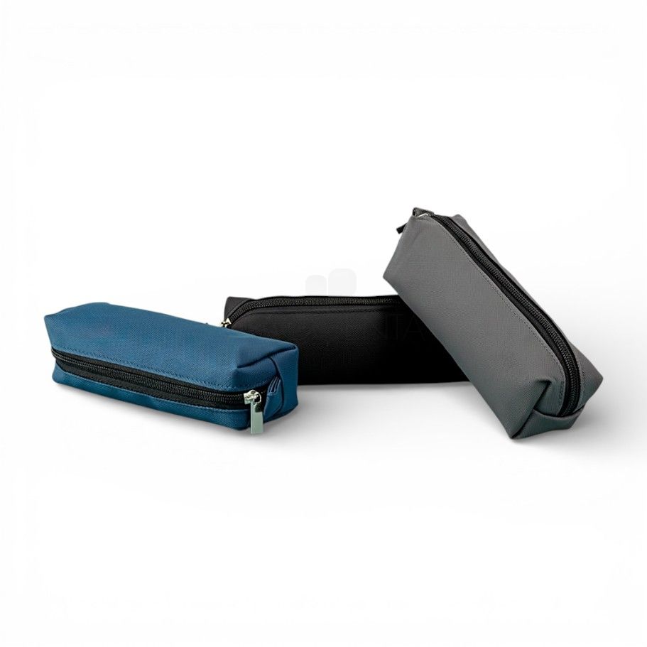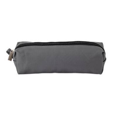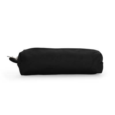 Estojo confeccionado em couro sintético com fechamento em zíper e uma pequena alça para fixação em chaveiro ou gancho.