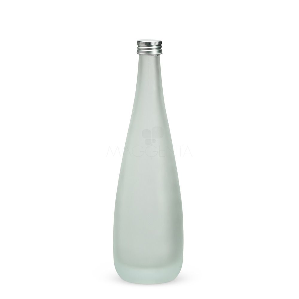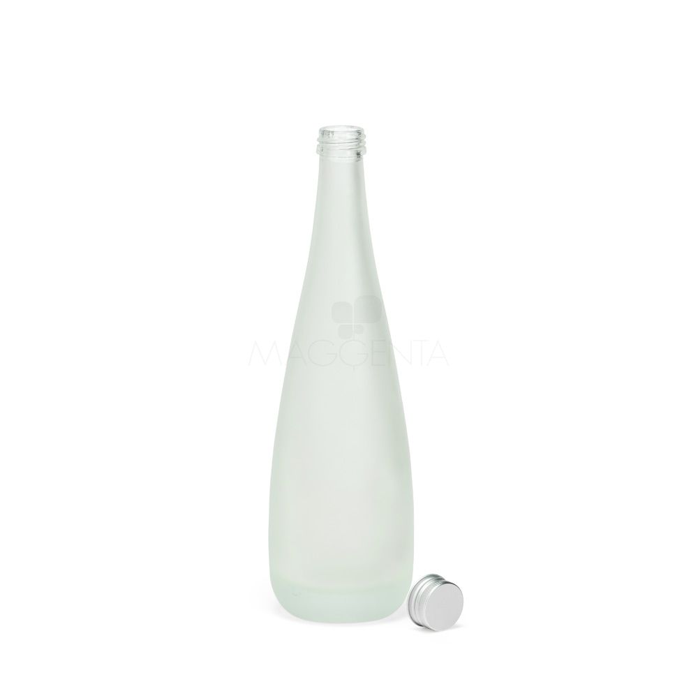 Garrafa de vidro com acabamento fosco, tampa rosqueável em alumínio e capacidade máxima de 550ml.
