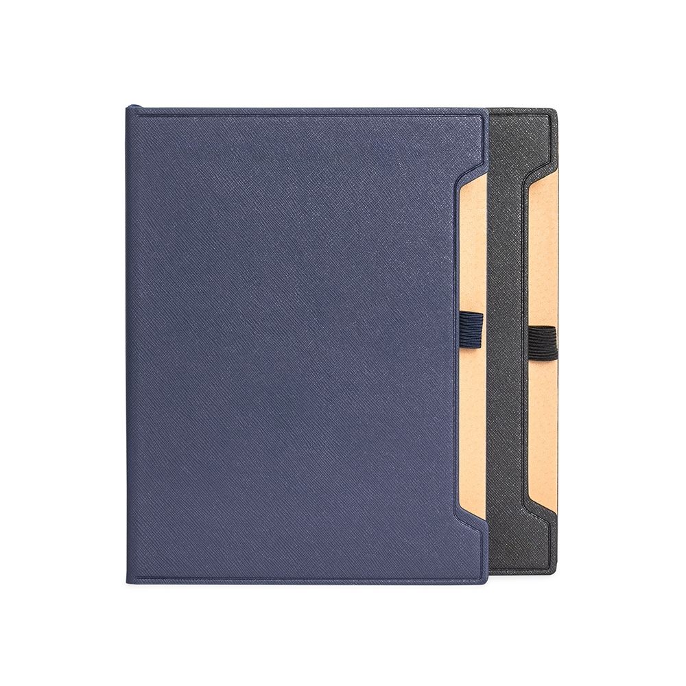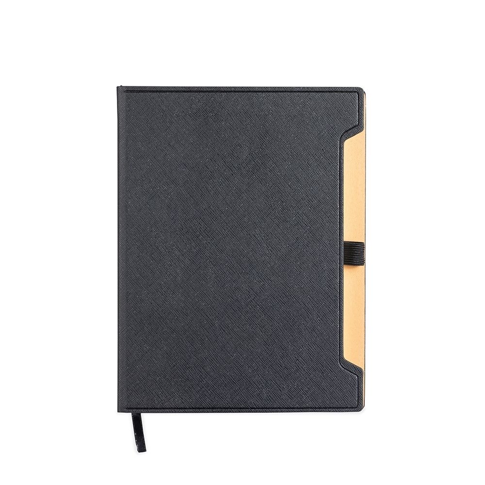 Caderneta com capa em couro sintético, suporte elástico para caneta, marca-páginas em fita de cetim e aproximadamente 96 folhas marfim pautadas.