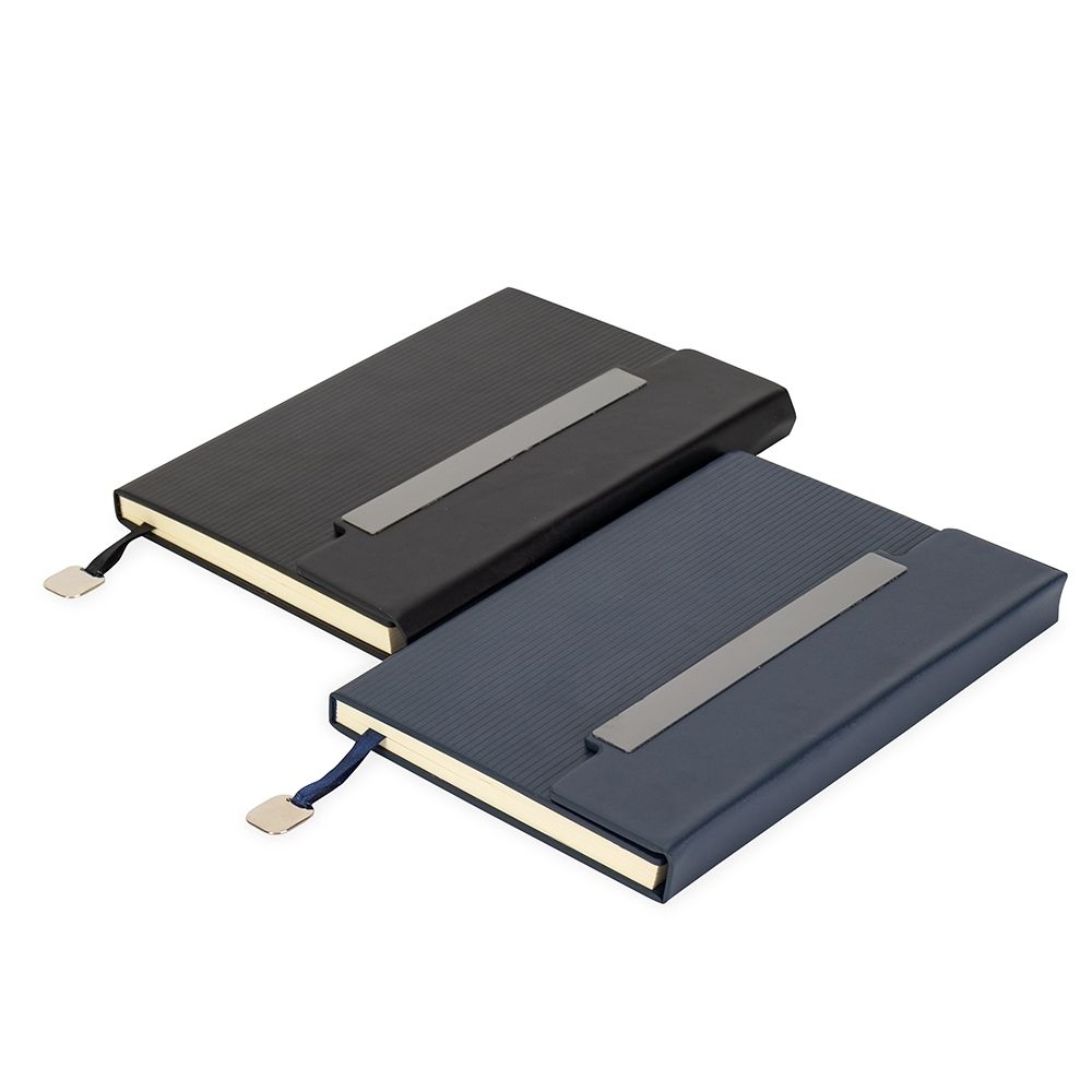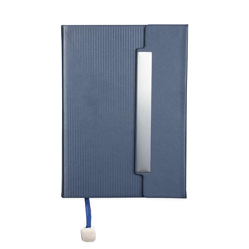 Caderneta com capa em couro sintético levemente texturizada, marca-páginas em fita de cetim com plaquinha metálica decorativa, aba de fecho magnético com placa metálica e cerca de 96 folhas marfim pautadas.