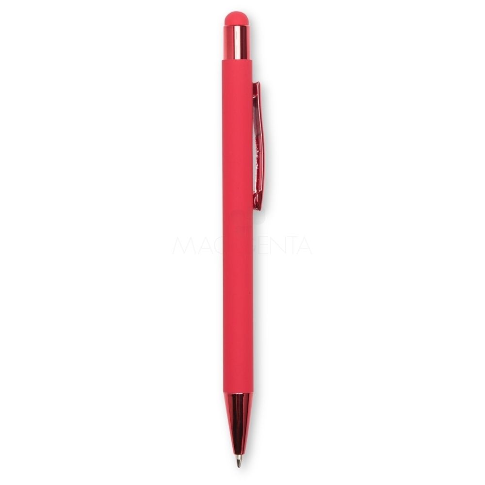 Kit executivo com duas peças, composto por uma caderneta de capa em couro sintético com fechamento magnético e cerca de 80 folhas pautadas, e uma caneta em metal com detalhes em plástico, ponteira emborrachada para uso em dispositivos touchscreen e carga esferográfica azul de 1,0 mm. Acompanha uma caixa de papelão com berço em espuma para a caneta.