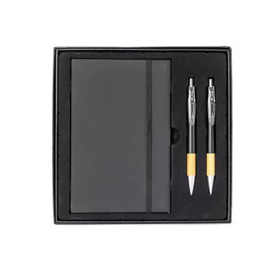 Kit executivo com três peças, composto por uma caderneta, uma caneta e uma lapiseira. A caderneta possui capa dura em papelão reforçado, fechamento em elástico, cerca de 82 folhas pautadas, bloco de folhas amarelas e outro com marcadores autoadesivos coloridos. A caneta e a lapiseira contam com corpo em plástico e detalhes em bambu. Além disso, a caneta possui carga esferográfica azul de 1,0 mm, enquanto a lapiseira dispõe de grafite de 0,7 mm. Acompanha caixa em papelão com berço em plástico para guardar os itens do conjunto.
