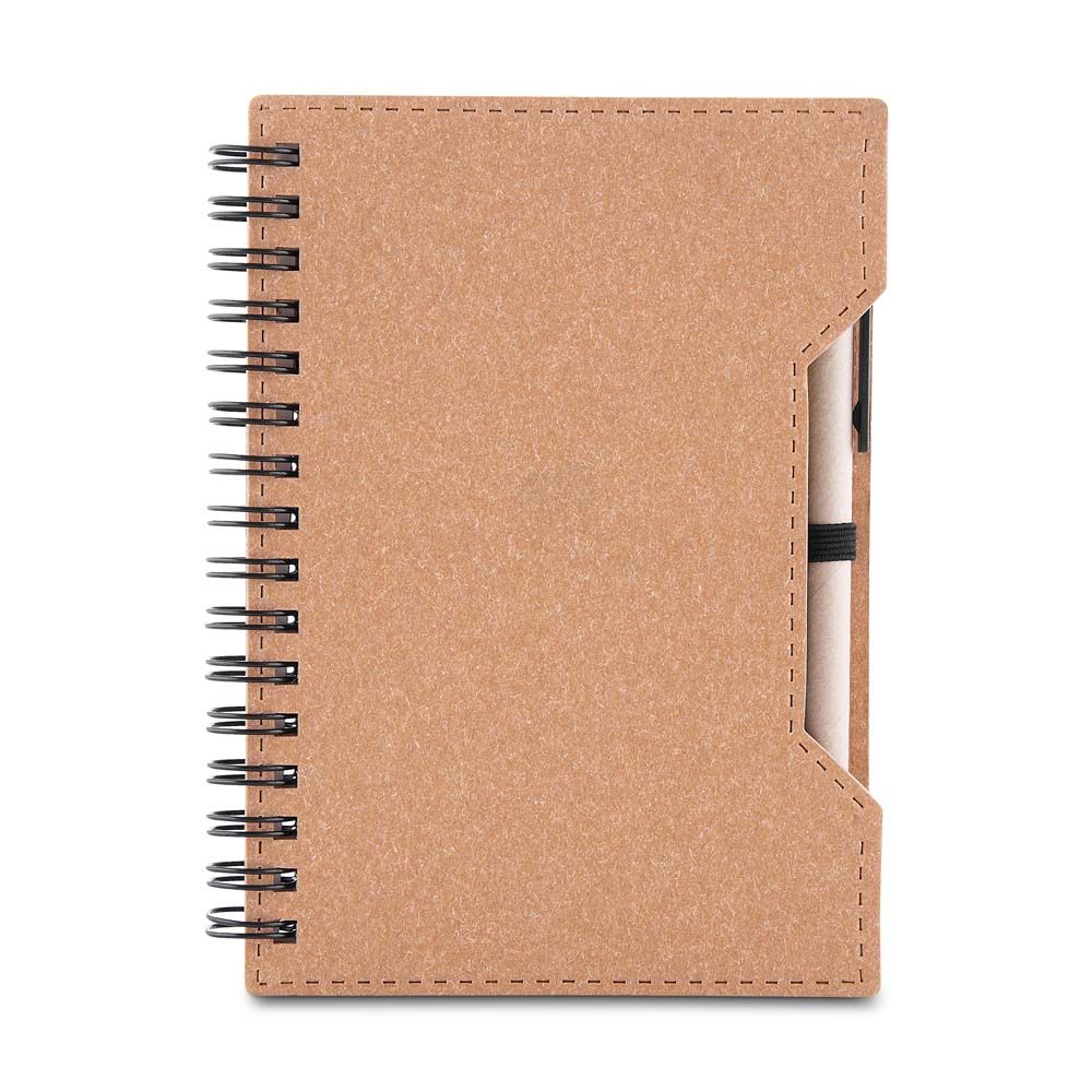 Kit composto por caderno com capa em papelão, com miolo de 70 folhas sem pauta em papel 70g/m². Acompanha caneta confeccionada em papelão reciclado com detalhes em plástico. com sticky notes para anotações.